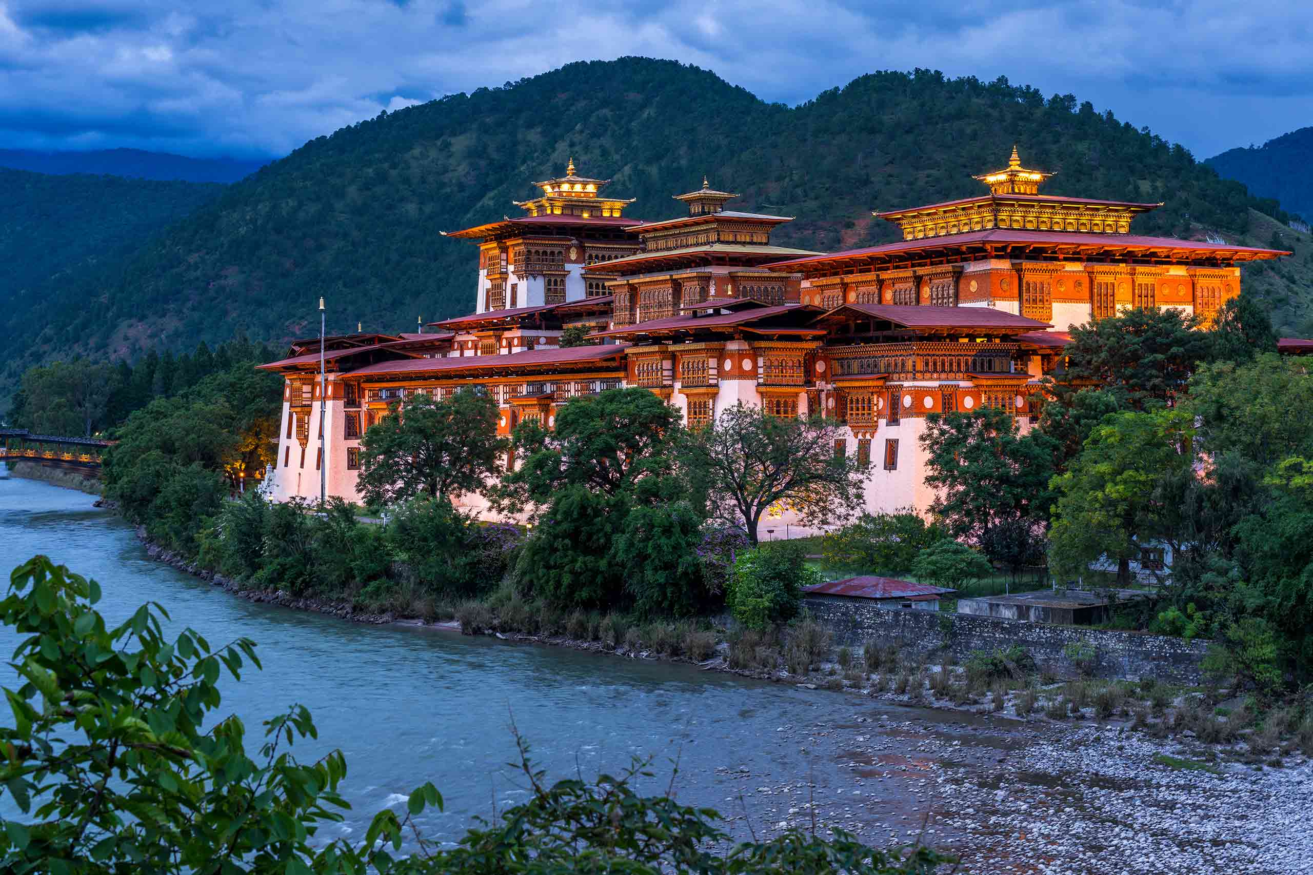 Often described as the most beautiful dzong in Bhutan, Punakha Dzong—“The Palace of Great Bliss”—stands proudly at the confluence of the Pho Chhu and Mo Chhu rivers. Its grand architecture, golden roofs, and iconic cantilever bridge make it a must-visit for every traveler. The dzong is also the winter residence of the Je Khenpo, the Chief Abbot of Bhutan.